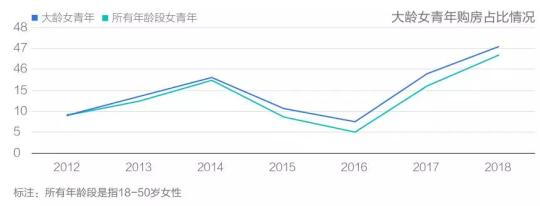 上述平台选取北京、深圳、上海、杭州、南京、武汉、重庆、合肥、郑州、长沙、苏州、西安共12个城市,提取2018年全年67724条二手房交易数据进行了分析。 结果显示,30-50岁大龄女青年购房者逐年增加,比例高于平均值。在已购房的大龄女青年中,29%是独立购房,约45%需要父母资助。